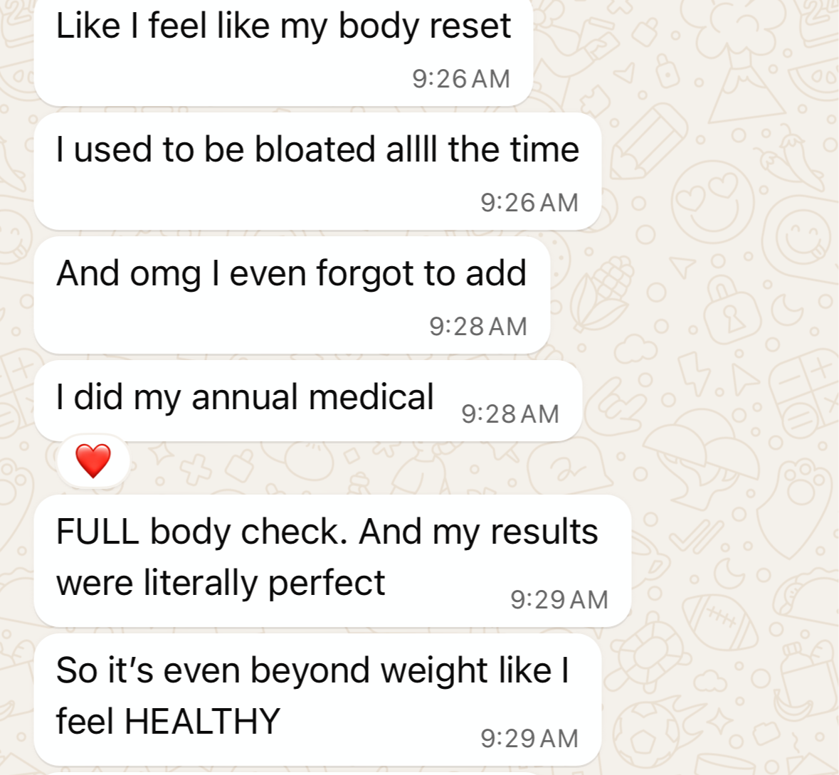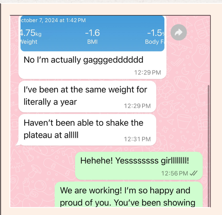 "I've dropped 5kg, but the real win? I finally feel in control. No more overthinking every choice. Yesterday I had a Nutella cup without guilt. The urge to binge is gone. I've found balance and finally feel peace with food."